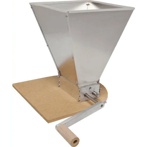 - You Know the Drill – This mill has a solid base and can be easily attached to an electric drill with no extra parts. At 500 RPM you can crush up to six pounds per minute. You can even create a “bench mill” by adding a motor, pulley wheel and belt.
